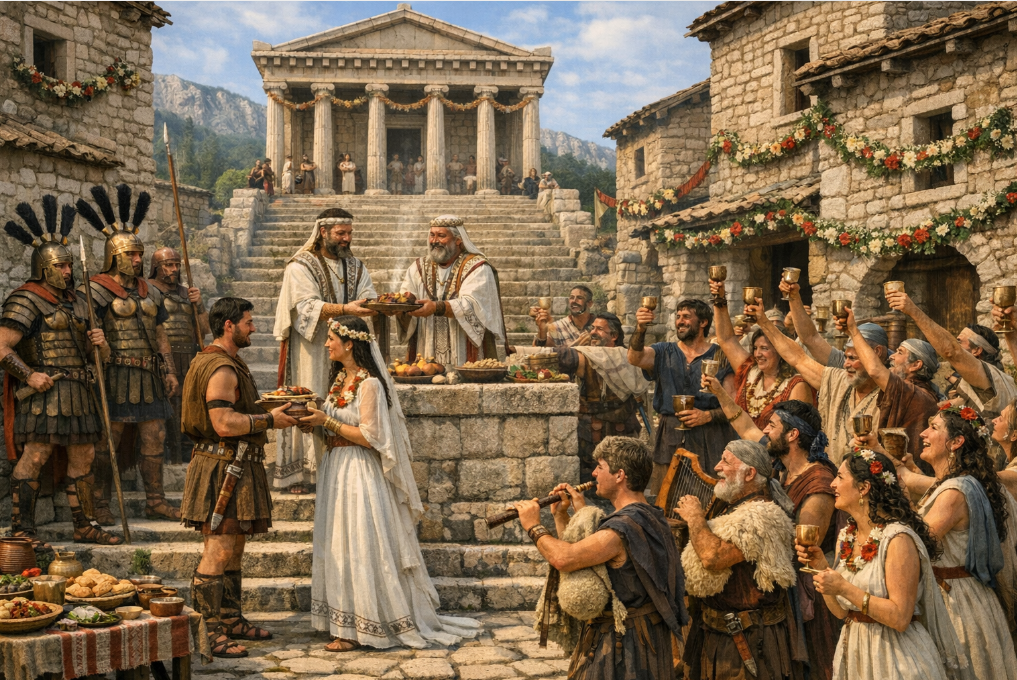 Le cerimonie nuziali degli antichi Sanniti erano eventi ricchi di rituali e significato. La celebrazione iniziava con un rito di benedizione condotto da sacerdoti, che invocavano le divinità per garantire prosperità e fertilità alla coppia. Gli sposi si scambiavano doni simbolici, come anelli, e partecipavano a festeggiamenti comunitari che includevano banchetti abbondanti e danze. Le donne indossavano vesti bianche e ornamenti come orecchini e collane, mentre gli uomini portavano coltelli come segno di status. La cerimonia si svolgeva in un contesto sacro, riflettendo l'importanza della religione nella vita quotidiana sannita.