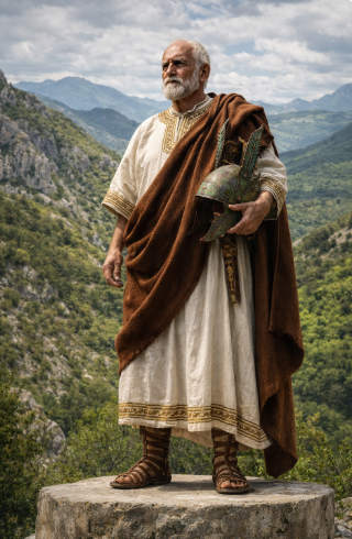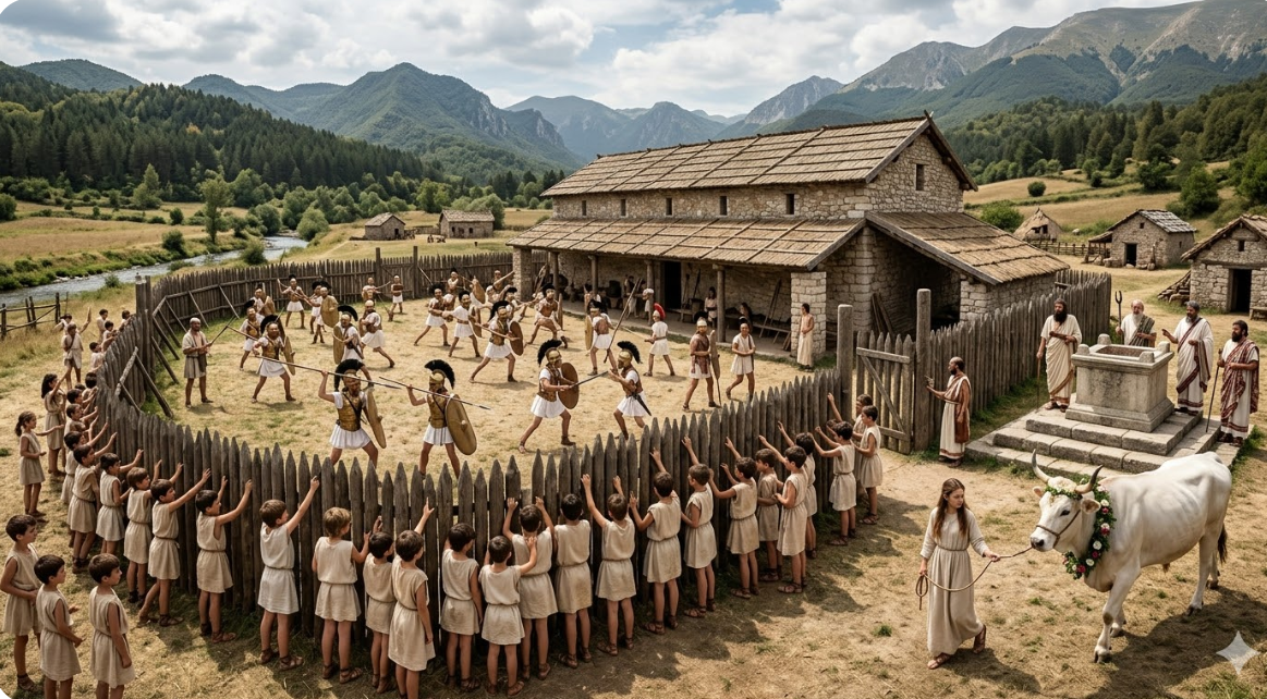 Crea un’immagine di un pagus dell’antico Snnio che era un distretto rurale semi-indipendente, che si occupava di questioni sociali, agricole e soprattutto religiose. Si pensa che qui avvenisse il reclutamento militare. C’era un lungo edificio di pietra con tetto di legno, sul cortile esterno circondato da un recinto di legno si addestravano al combattimento numerosi giovani guerrieri sanniti armati di lancia, spada corta, corazza, scudo ovale, tunica di lino corta e bianca, elmo sannita di bronzo con piume nere sul capo, intorno alla palizzata numerosi bambini vestiti con leggere tuniche corte di colori chiari assistevano alle esercitazioni dei guerrieri all’interno del recinto e tifavano per i più forti. Sul lato esterno dell’edificio c’era un’ara sacrificale con intorno dei sacerdoti con barba lunga, vestiti con lunghe tuniche e un bue con una corona di fiori sul collo pronto al sacrificio e tirato con una corda da una fanciulla con una tunica lunga di colore chiaro.