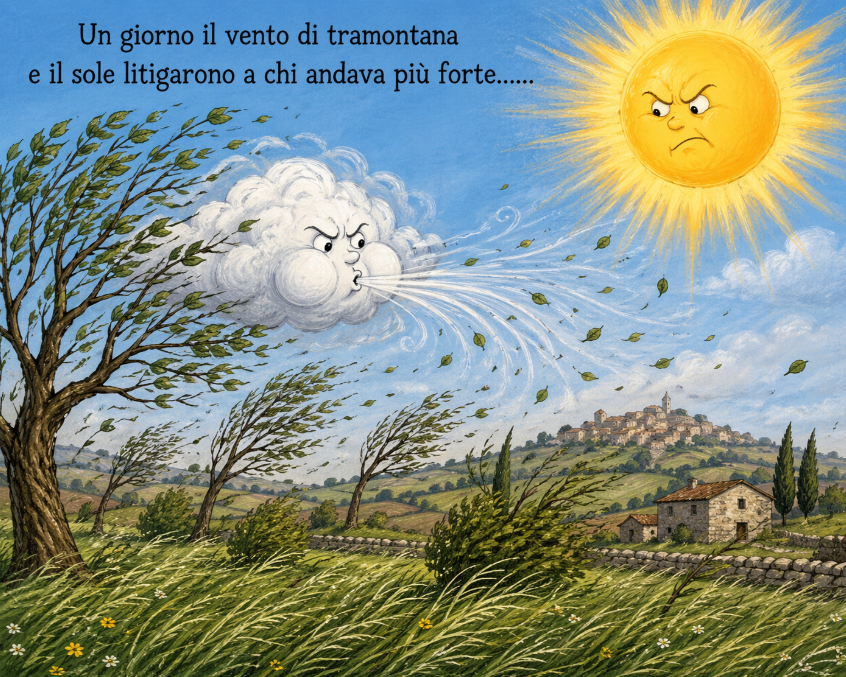 "Un giorno il vento di tramontana e il sole litigarono a chi andava più forte……."